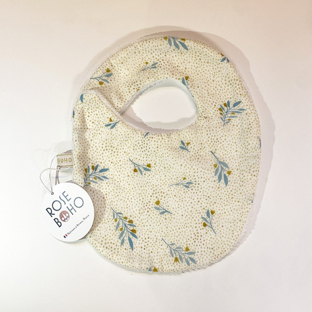 Ce bavoir bébé Eden de chez Rose Boho est pratique avec son velcro qui ferme sur le côté (quand le bébé ne tient pas encore sa tête). Il a un côté imprimé et une doublure en bouclette coton qui absorbe. Et c'est une création annécienne !